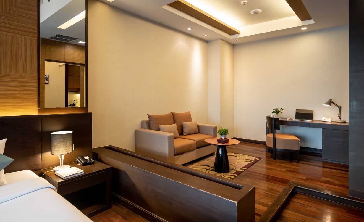 Our 44 m² Premier Corner Suites are a seamless blend of modern technology and Thai-inspired elegance. Complete with a double bed, desk, fully equipped kitchenette and bathroom, our suites also come with stunning city scape views.